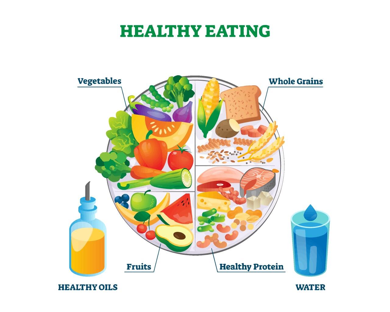 Ideal plate: complex carbohydrate (1cup rice, 1 slice of whole wheat toast,), protein (plant based if you can), vegetables and spinach with fatty acids. Looking at your plate and asking what nutrition my body will get from this meal is a good habit that helped me slowly change my eating habits into a healthy lifestyle.